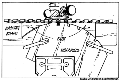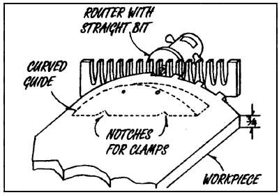 Keller uses this setup to rout dovetail sockets on a radius, such as the semi-circular ends of a barrel-top chest. The workpiece is clamped to a backing board, and held in position between After cutting the first socket, Keller unclamps the workpiece, rotates it slightly, resets the clamps and cuts the next socket. For safety, it's best to orient the work so the operator stands behind the workpiece, so the chips fly away from him or her.